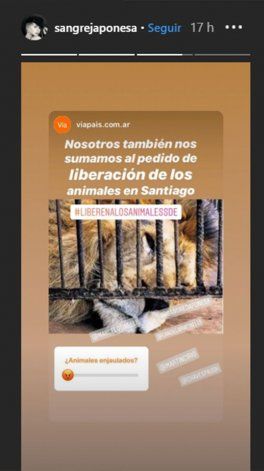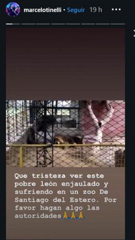 "Que tristeza ver este pobre león enjaulado y sufriendo en un Zoo de Santiago del Estero. Por favor hagan algo las autoridades", escribió el conductor en Instagram Stories junto a una foto del felino.