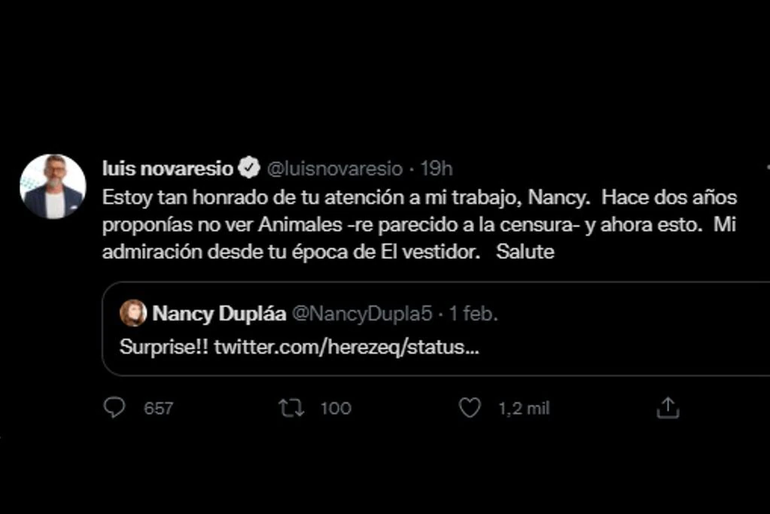Al ver la reacción de la esposa de Pablo Echarri, el periodista no se quedó atrás y le respondió filoso en la red del pajarito. "Estoy tan honrado de tu atención a mi trabajo, Nancy. Hace dos años proponías no ver Animales (Sueltos) -re parecido a la censura- y ahora esto. Mi admiración desde tu época de El vestidor. Salute".