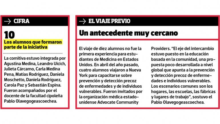 “Cuando uno piensa en un viaje de estudios a Estados Unidos, se imagina un gran hospital con la última tecnología”, detalló Pablo Olavegogeascoechea, profesor del Departamento de Salud Colectiva de la facultad cipoleña y referente del viaje, que llevó a diez alumnos de quinto, sexto y séptimo año a realizar una práctica con la organización Somos Community Care de Nueva York. “Esto, sin embargo, fue lo opuesto, vimos la medicina no enfocada en la especialización, sino en las necesidades comunitarias”, agregó.