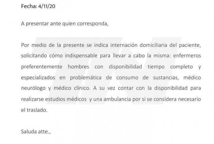 El equipo psiquiátrico solicitaba específicamente la presencia de un médico neurólogo, un clínico y enfermeros, preferentemente hombres, especializados en tratamiento de pacientes con adicciones. A su vez, pusieron como condición la estancia de una ambulancia permanente, por si se consideraba necesario el traslado. Otro de los requisitos de los especialistas era que el futbolista debía “contar con la disponibilidad para realizarse estudios médicos cuando fuera necesario”. El documento fue enviado a la prepaga de Maradona para que lo autorice.