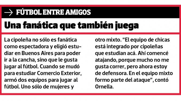 Ornella confía en que el viaje no será en vano. “El equipo está bien, y por surte jugamos con (Cristian) Pavón. Tengo mucha confianza en ellos y creo que van a poner todo para volver con la Copa”, expresó sobre el equipo xeneize.