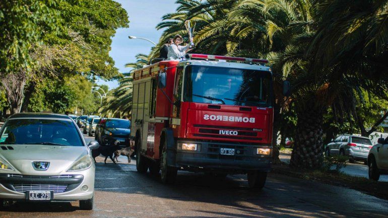 Tras pisar suelo rionegrino, Gladys Castaños encabezó una caravana por las calles principales de la capital junto a su hija en el camión autobomba de Bomberos, recibiendo el cálido saludo de los vecinos que la veían pasar con los trofeos obtenidos.