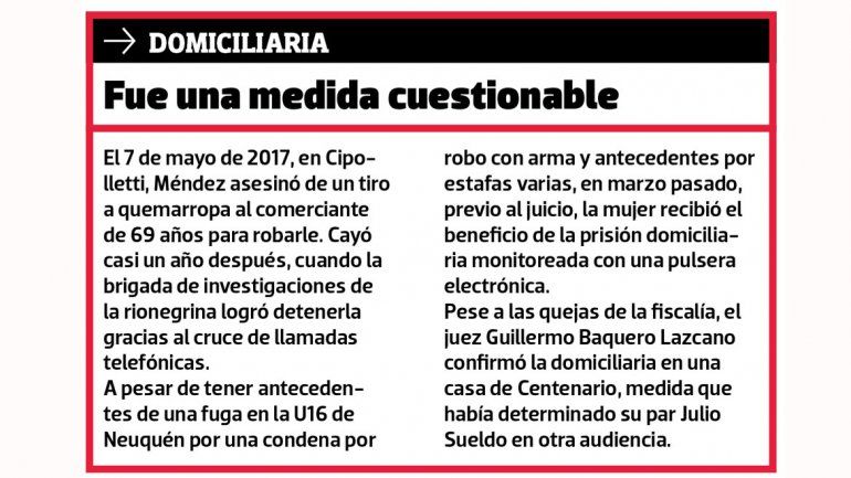 Méndez salió de la sala de audiencias y se fue a su casa en Villa Obrera de Centenario, donde gozaba del beneficio de la prisión domiciliaria monitoreada con una pulsera electrónica y la obligación de acudir dos veces al día a una comisaría neuquina.