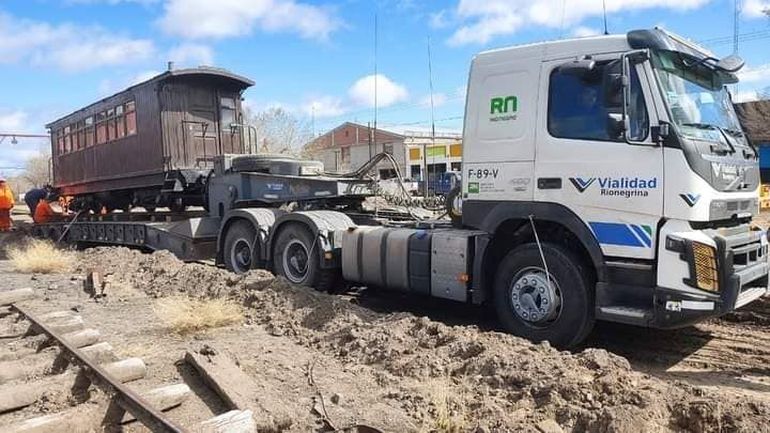 Una locomotora y un vagón comedor fueron cargados en carretones de Vialidad Rionegrina, en un operativo realizado el domingo que fue destacado por la gobernadora Arabela Carreras.