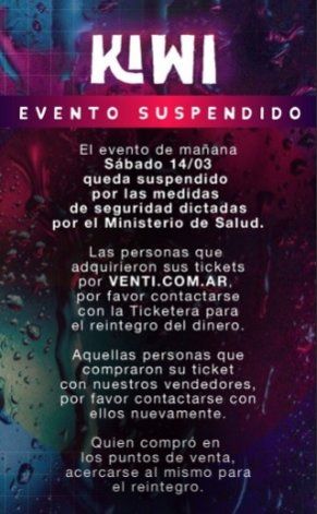 En el caso de la fiesta Kiwi, que estaba prevista realizarse en la noche del sábado en el complejo La Finca, fue suspendida y los organizadores prometieron devolver el dinero de las entradas.
