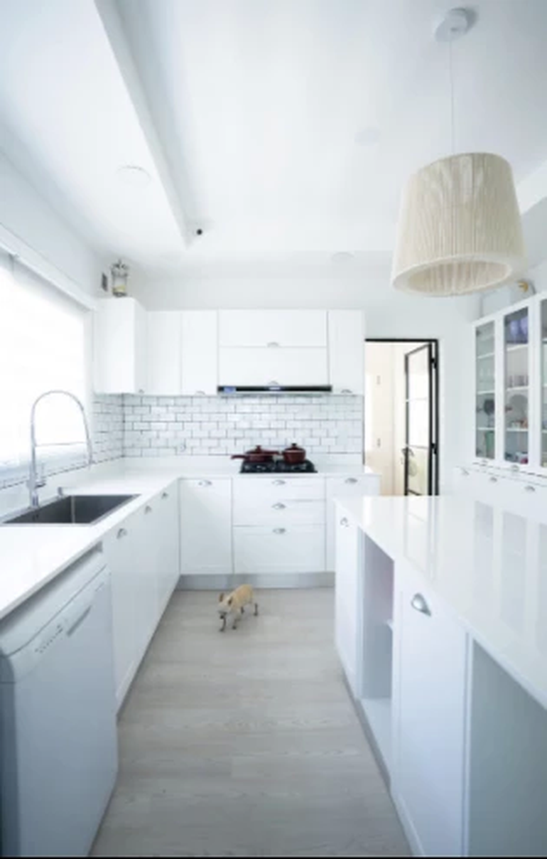 Luego llegó el turno de mejorar la cocina. Allí puso mucho empeño, ya que contaba con material a explotar y espacio mal utilizado. En ese sector también priorizó el total white, tanto para los muebles, como para los azulejos y también los electrodomésticos.