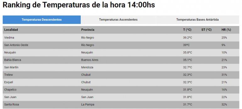 Las Grutas y Viedma encabezan la lista de las ciudades más calurosas del país, seguidas por Neuquén.