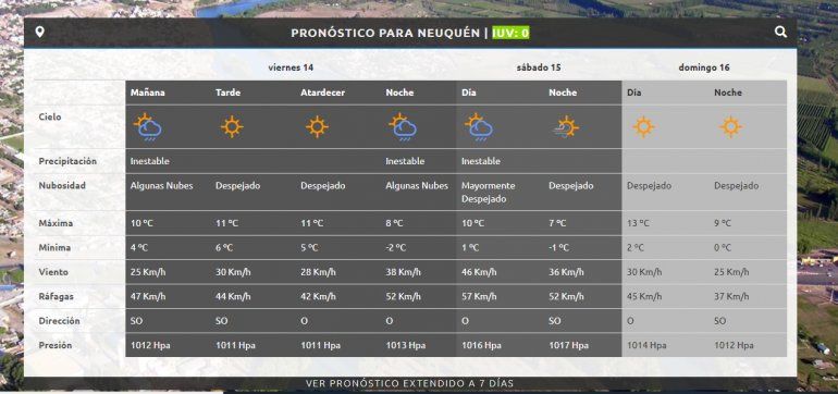 Si bien las tormentas estaba pronosticadas para la tarde del jueves no se hicieron presente y este viernes amaneció despejado pero algunas ráfagas que podrían traer nubes. Para la jornada de hoy se mantiene la probabilidad de algunas precipitaciones durante la noche. La mínima estipulada está en los -2°C y la máxima en 11 grados.