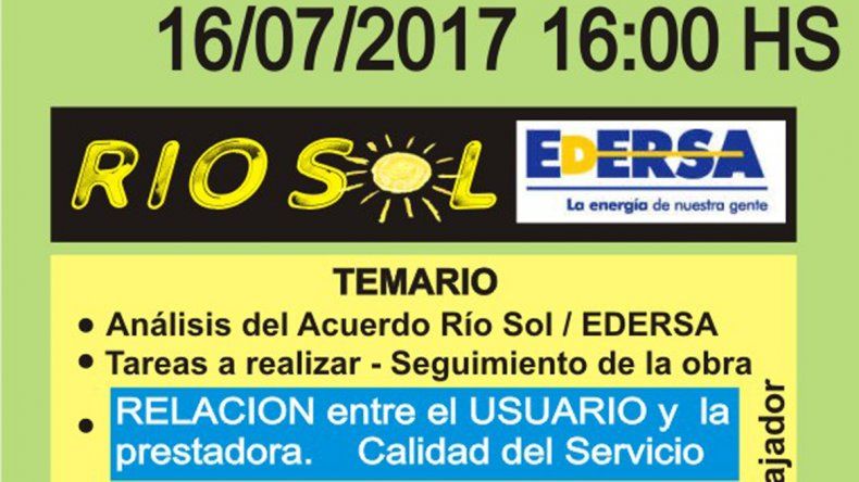 El encuentro será en la casa de uno de los ciudadanos, ubicada entre las calles Río Limay y Avenida del Trabajador de Las Perlas, en donde analizarán el acuerdo Río Sol/EDERSA, las tareas a realizar por parte de la empresa y las obras por continuar, además de la relación entre la prestadora del servicio y los vecinos del barrio Río del Sol.