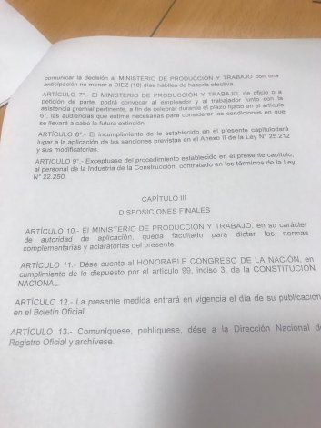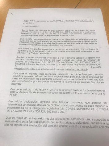 "Las partes signatarias de los convenios colectivos de trabajo, representantes de los trabajadores y empleadores, podrán adecuar la implementación de lo dispuesto en el presente decreto en materia de plazos y montos para aquellas actividades o sectores que se encuentren especialmente en crisis o en declinación productiva", dice el artículo tercero.