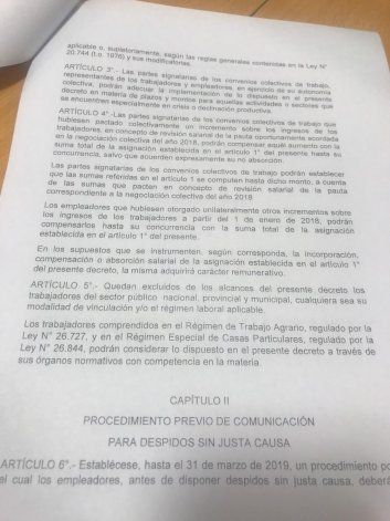 "Establécese hasta el 31 de marzo de 2019 un procedimiento por el cual los empleadores, antes de disponer despidos sin justa causa, deberán comunicar la decisión al ministerio de Producción y Trabajo con una anticipación no menor a diez días hábiles de hacerla efectiva", dice el borrador del decreto.