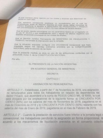 El borrador del decreto que firmaría el presidente Mauricio Macri en los próximos días para el pago de un bono de 5.000 pesos para los trabajadores del sector privado se hizo público y en el mismo se observa que las empresas debe avisar el Gobierno diez días antes de despedir empleados.