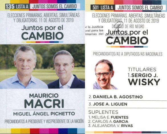 La lista 501, que a nivel nacional postula a Mauricio Macri para presidente y Miguel Ángel Pichetto para vice, lleva como primer precandidato a diputado nacional a Sergio Wisky, seguido por Daniela Agostino y José Liguen. Para el Senado Juntos por el Cambio decidió bajar a sus candidatos.