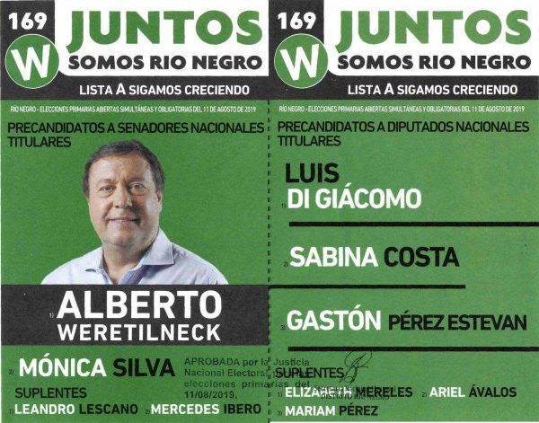 La lista 169 de Juntos Somos Río Negro es boleta corta. Para senadores están los candidatos Alberto Weretilneck y Mónica Silva, mientras que para Diputados se encuentran Luís Di Giácomo, Sabina Costa y Gastón Pérez Estevan.