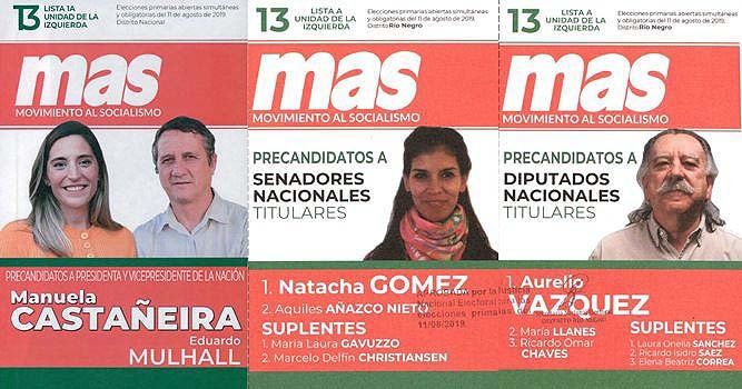 La lista 13 de Movimiento al Socialismo (MAS) postulan a nivel nacional a Manuela Castañeira a la presidencia y Eduardo Mulhall a la vicepresidencia. En Río Negro los candidatos a diputados son Aurelio Vázquez, María Llanes y Ricardo Omar Chávez. Para senadores llevan como precandidatos a Natacha Gómez y Aquiles Iñazco Nieto.