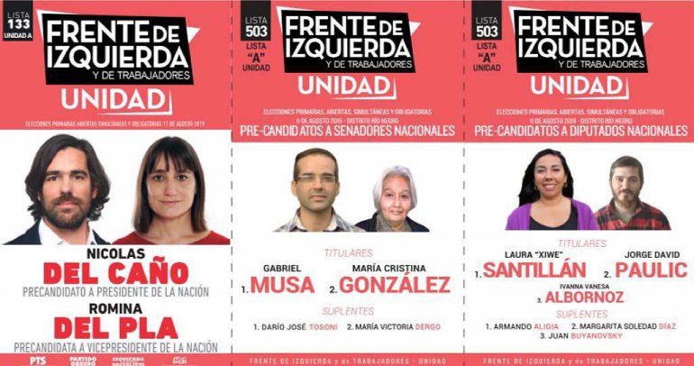 La lista 133 del Frente de Izquierda van bajo las precandidaturas de Nicolás del Caño para presidente y Romina del Pla como vice. El FiT rionegrino sólo postuló para el Senado a Gabriel Musa y María cristina González. Para diputados postularon a Laura "Xiwe" Santillán, Jorge David Paulic e Ivanna Vanesa Albornoz.