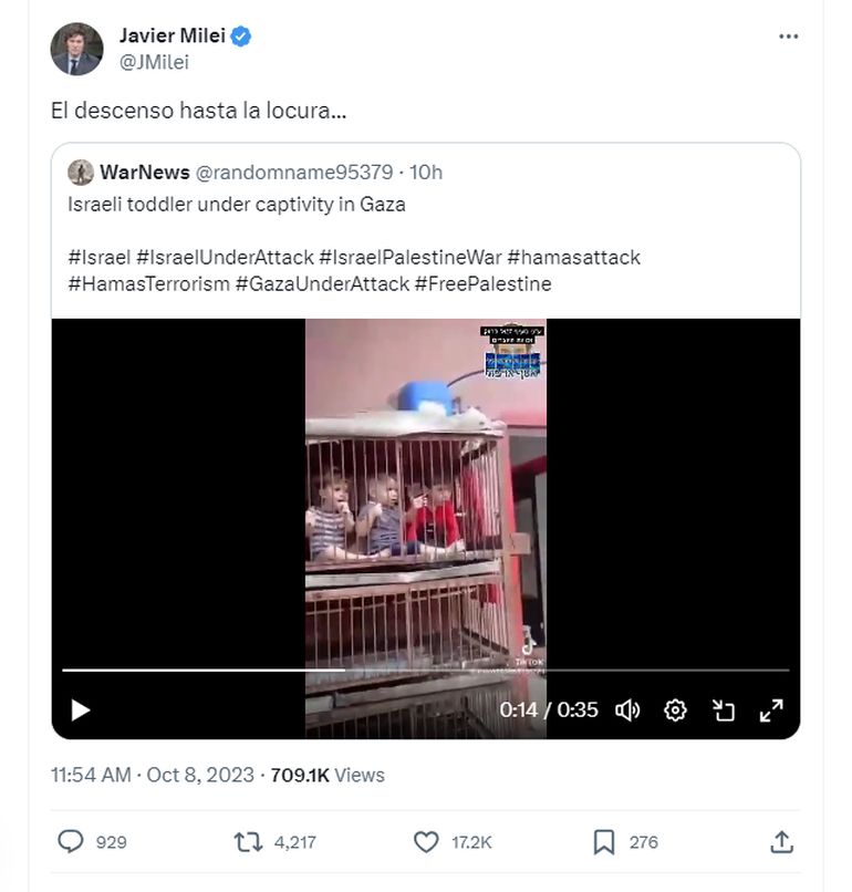 Horas antes del último debate de los candidatos a presidente, Javier Milei utilizó sus redes sociales para compartir unas conmovedoras imágenes de lo que atraviesan los niños israelíes rehenes en Gaza. “El descenso hasta la locura”, aseguró el libertario.