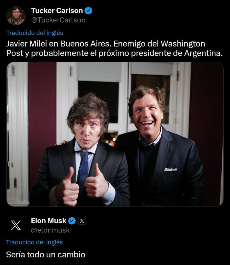 En plena campaña electoral, Carlson entrevistó a Milei en X con una repercusión de 300 millones de vistas, histórico para la red social, lo que motivó la reacción de su dueño.