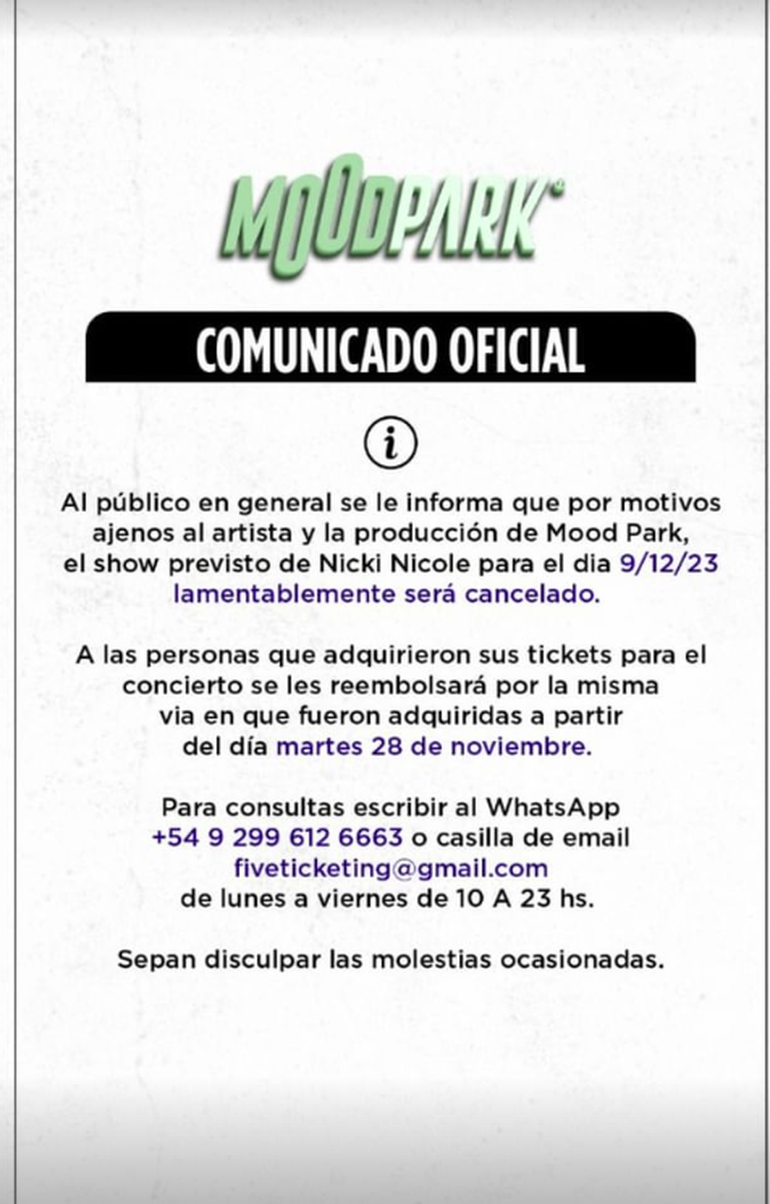 Según informaron desde la organización, "por motivos ajenos a la artista y a la producción de Mood Park, el show previsto de Nicki Nicole lamentablemente será cancelado".