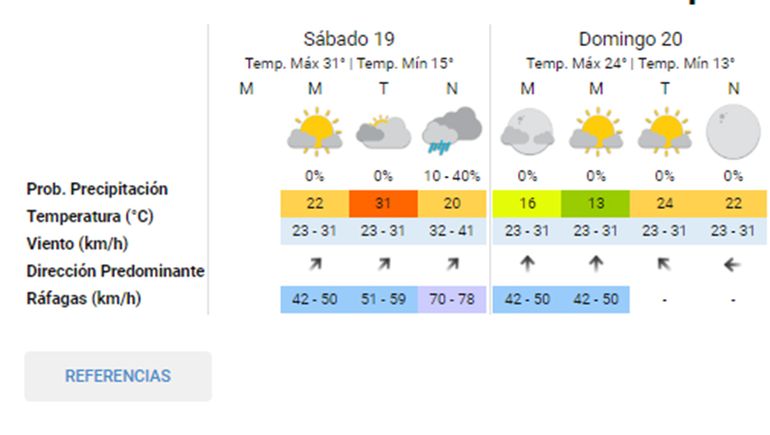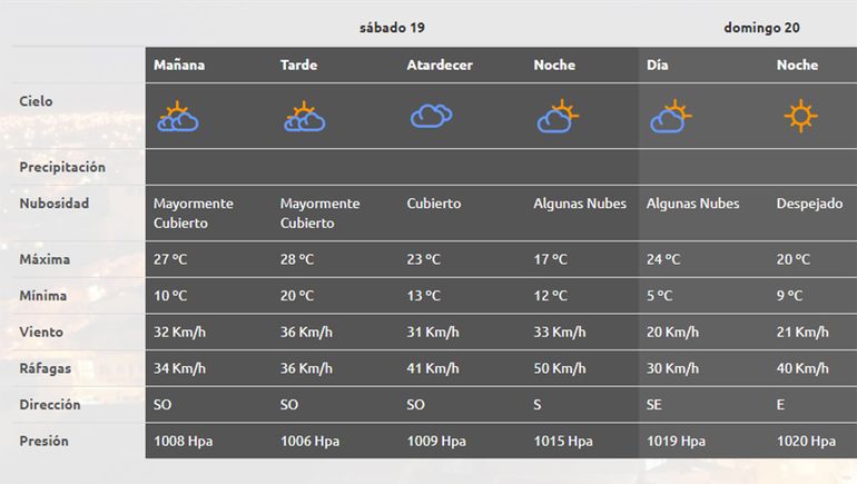 Ese mismo ente, para el domingo informó que se espera una máxima de 24°C y una mínima de 5°C, con un cielo que pasará de tener “algunas nubes” en la mañana, a mostrarse completamente despejado en la noche; y con ráfagas de viento que no superarán los 40km/h.