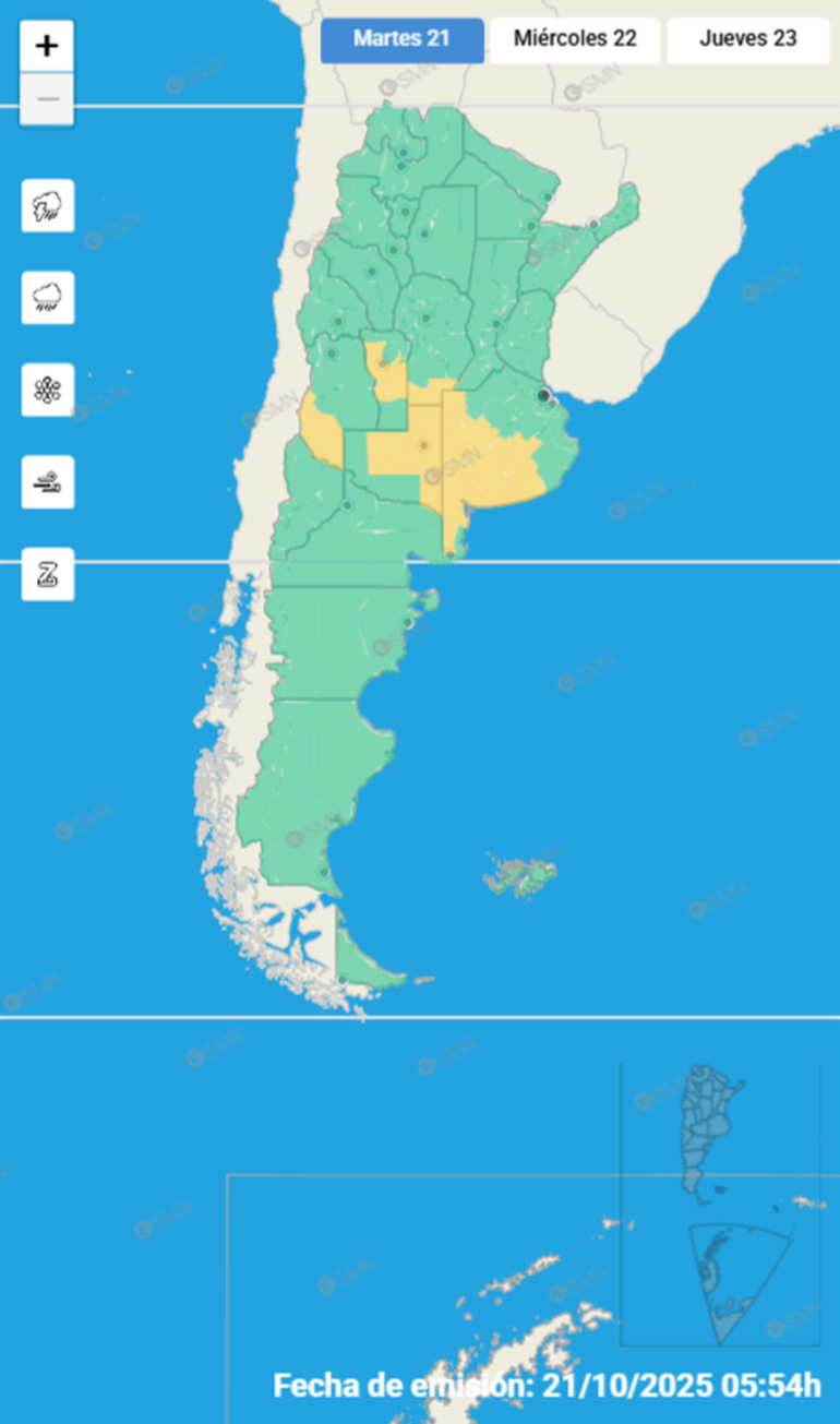 Por un lado, rige para este martes 21 de octubre una alerta de nivel amarillo. La nueva advertencia del organismo dependiente del Ministerio de Defensa indicó que el área será afectada por tormentas, algunas localmente fuertes.