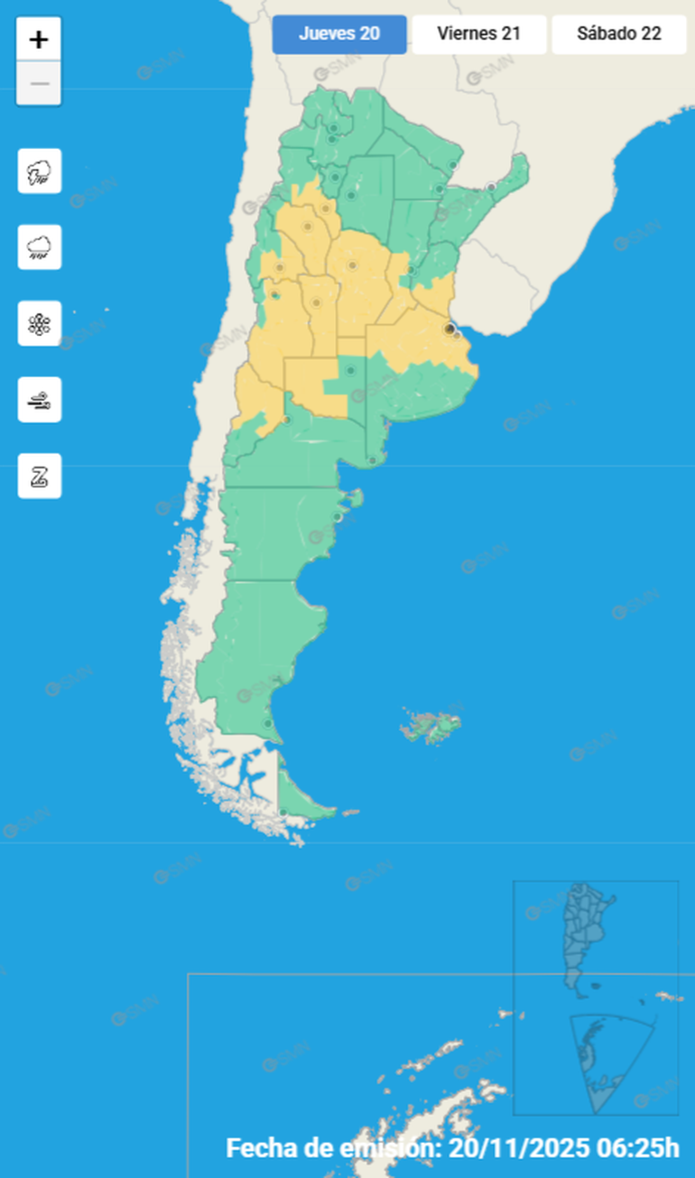 El Servicio Meteorológico Nacional (SMN) emitió en las últimas horas una serie de alertas de nivel amarillo que afectarán a casi la mitad del país este jueves 20 de noviembre.