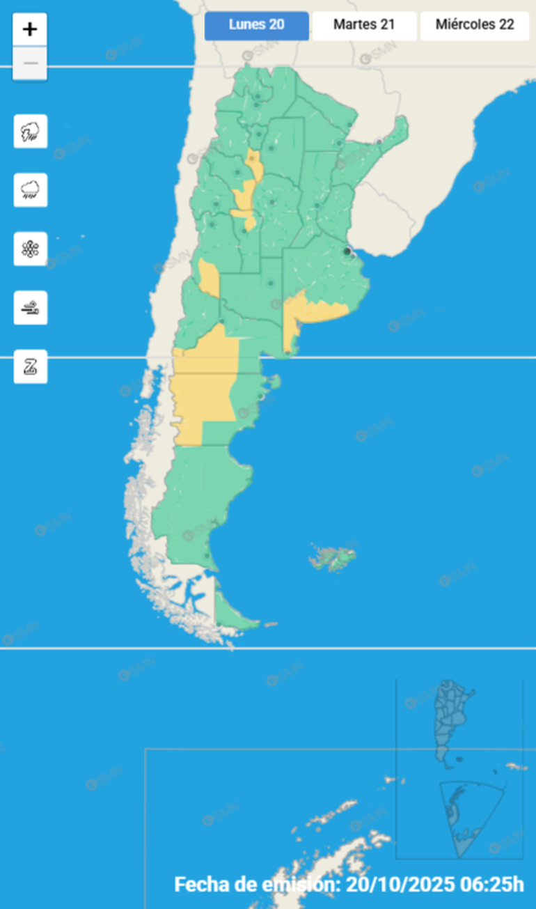 En este contexto, el SMN destacó que la alerta amarilla por fuertes vientos afectará al suroeste de la provincia de Buenos Aires, noroeste de San Luis, noreste de Mendoza, sureste de La Rioja, sureste de Catamarca.