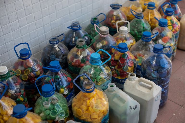 El proceso comienza con la recolección de tapitas plásticas. Luego se clasifican por color, se lavan y se trituran hasta convertirse en materia prima.