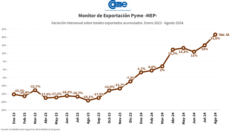 Según la Confederación Argentina de la Mediana Empresa (CAME), las exportaciones de las empresas pymes crecieron 21,6%, alcanzando los USD 6.405 millones exportados, lo que representa el 11,9% del total exportado por la República Argentina en el período enero-agosto 2024.