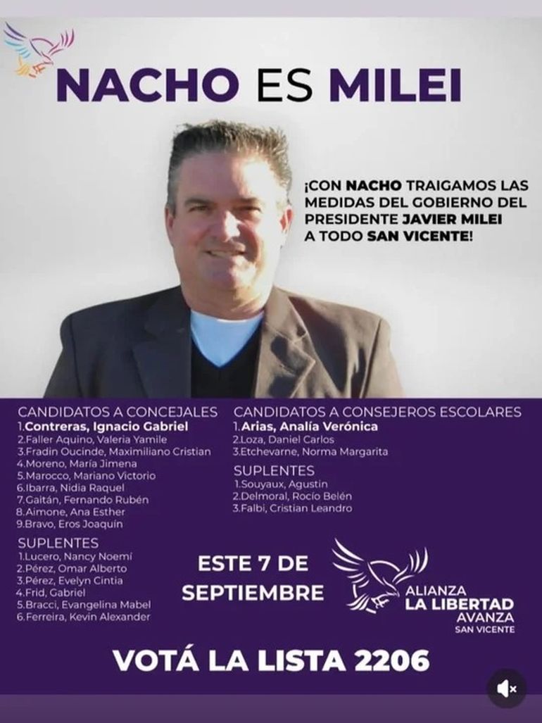El empresario Ignacio Contreras es conocido en la zona por ser propietario de la cadena "Lácteos Mi Viejo" y encabezó la lista del espacio liderado por Javier Milei en las elecciones municipales del pasado 7 de septiembre. Tenía previsto asumir su banca en el Concejo Deliberante de San Vicente el próximo 10 de diciembre.