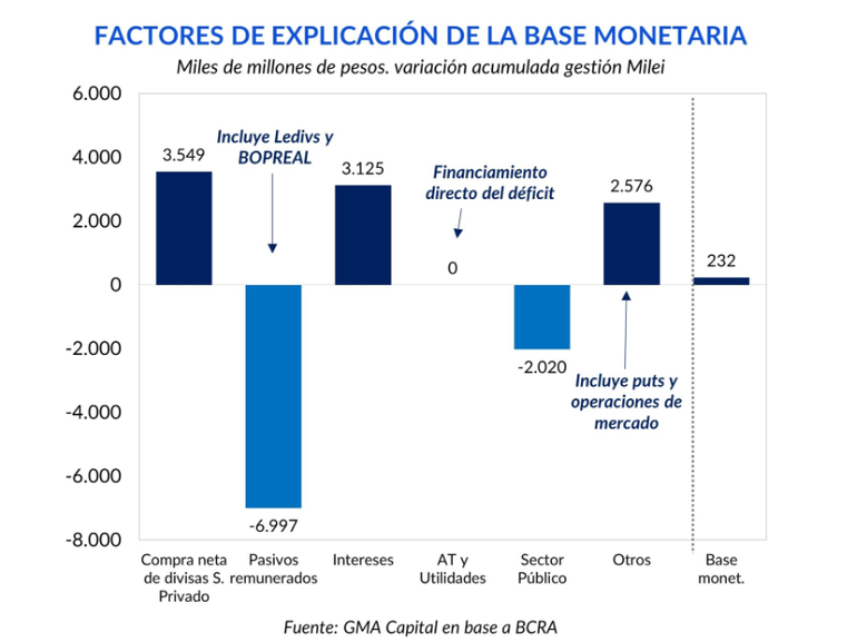 Según señala la sociedad de bolsa GMA Capital en su último informe semanal el motor principal de creación de pesos desde que Milei asumió la máxima magistratura fue la compra de divisas en el marco de la recomposición del nivel de reservas.