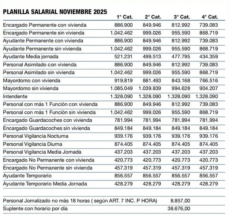 Con el nuevo aumento, para quienes estén encuadrados en la figura de "encargado permanente sin vivienda», los salarios mínimos serán los siguientes: