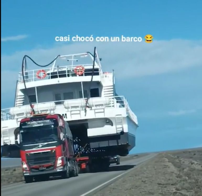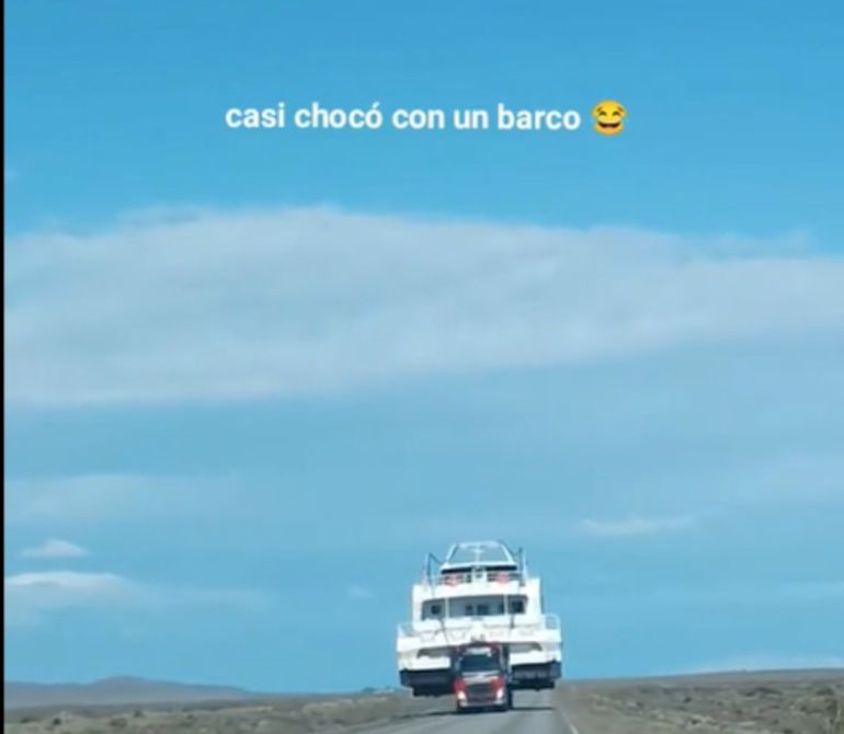 Otro video que circuló masivamente muestra a un automóvil intentando sobrepasar al camión que transportaba el catamarán, evidenciando la imponente estructura de la embarcación y la dificultad que implicó su traslado.