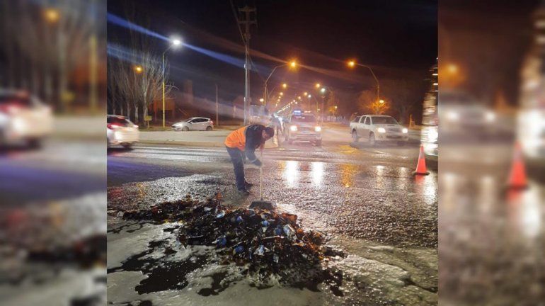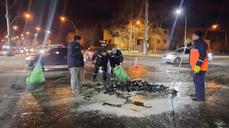 "El personal estuvo limpiando varias horas porque las botellas se desparramaron bastante", comentó el jefe de Servicios Públicos, Luis Flores.