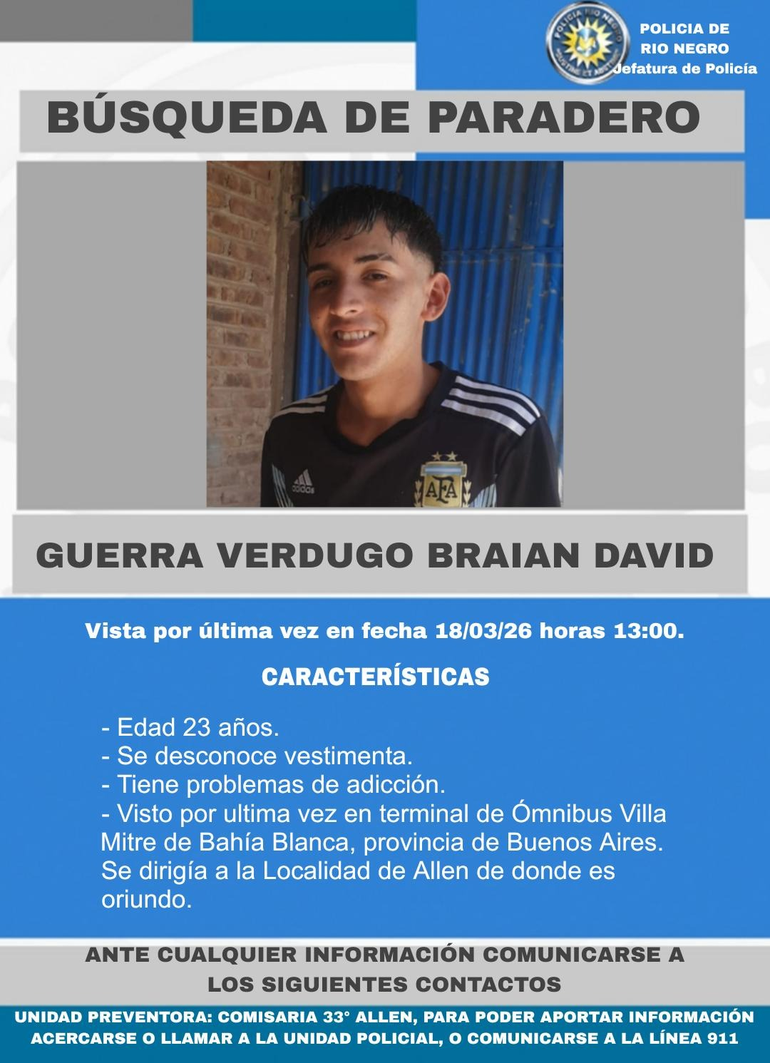 El segundo caso es el de Braian David Guerra, de 23 años, oriundo de Allen.