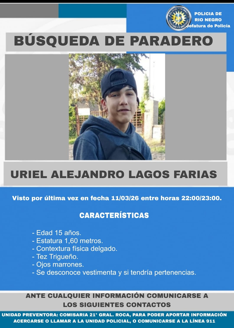 Uriel Alejandro Lagos Farías, de 15 años, fue visto por última vez el 11 de marzo de 2026. Desde entonces, no hay información sobre su paradero.