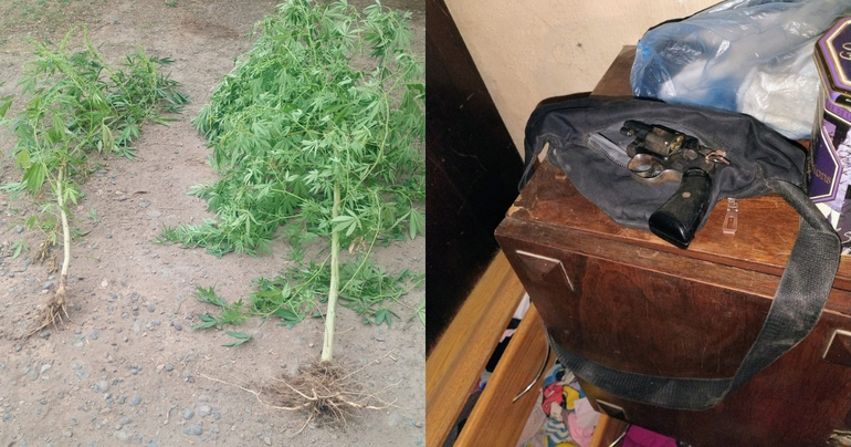 El operativo permitió incautar 32 plantas de cannabis, un rifle calibre 22, cargadores, municiones, una balanza de precisión y un equipo de comunicación que operaba con frecuencia policial.