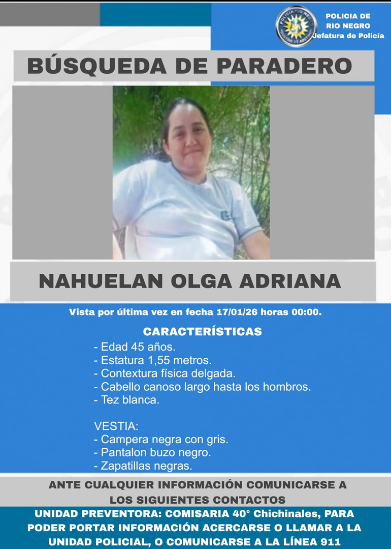 Se trata de Olga Adriana Nahuelan, de 45 años, quien se retiró de su domicilio en Chichinales el día 17 de enero de 2026 a las 00:00 horas. Desde ese momento, desconocen su paradero e intentan encontrarla.