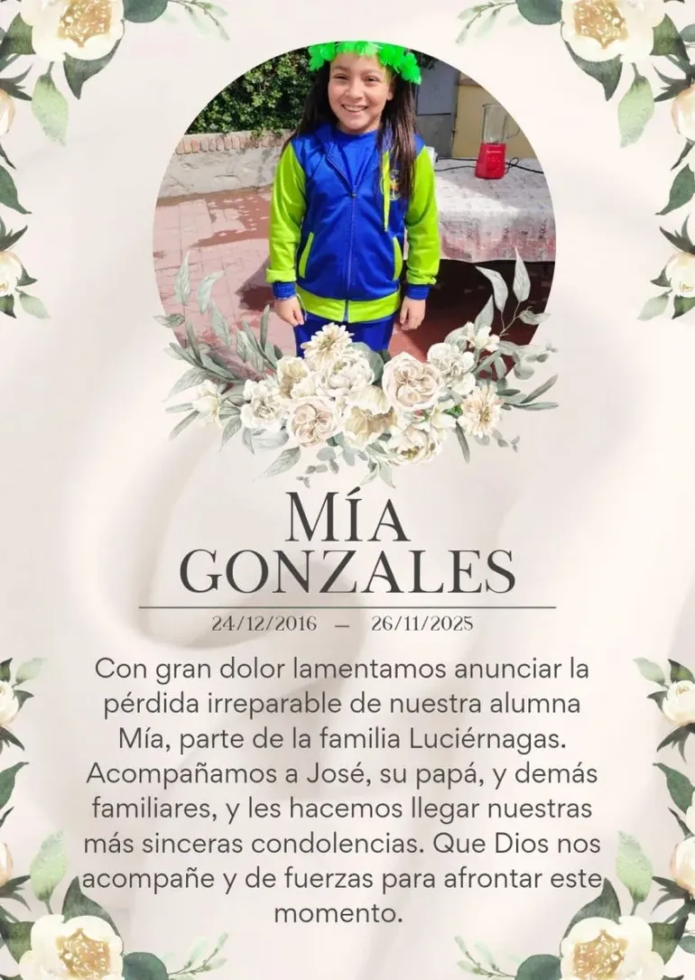Tras confirmarse la identidad de la menor, desde la comunidad educativa a la que asistía difundieron un mensaje cargado de dolor. Se trata de Mía Gonzales, de 8 años, a punto de cumplir 9: “El paso de Mía fue corto, pero inmenso. En sus risas, sus juegos y cada uno de sus gestos dejó una huella que no se borra”, expresó el establecimiento. Además, acompañaron con palabras de apoyo a su papá José y a toda la familia.