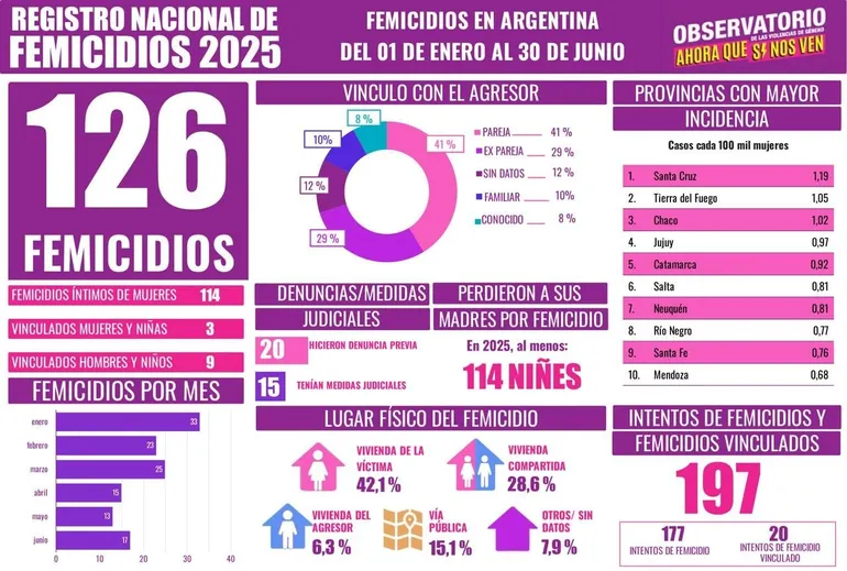 Lamentablemente los femicidios en Argentina siguen en aumento. Según los últimos registros del Observatorio "Ahora que si nos ven", del 1° de enero al 30 de junio se contabilizaron 126 femicidios, lo que indica un femicidio cada 34 horas. A su vez, el organismo reveló que hubo un total de 198 intentos de femicidios.
