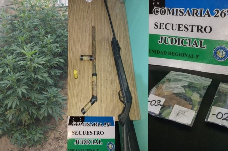 Como resultado, los uniformados incautaron una escopeta de fabricación casera tipo “tumbera”, un cartucho calibre 12 de “propósito general”, un rifle de aire comprimido, nueve plantas de cannabis sativa de aproximadamente dos metros de altura y recortes de nylon presuntamente utilizados para el fraccionamiento de estupefacientes.