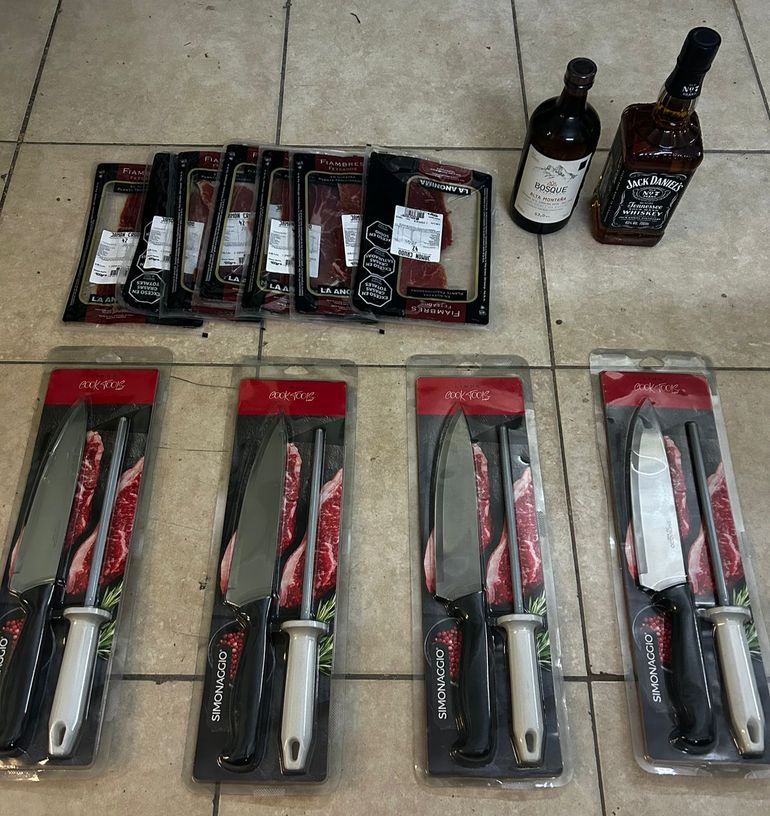 Al ser requisado, se constató que escondía siete sobres de fiambre tipo jamón crudo, una botella de ginebra marca Bosque, un whisky Jack Daniel’s y cuatro chairas con cuchillos en paquete cerrado. Según el ticket de referencia aportado por el comercio, el valor total de los productos ascendía a $115.320.