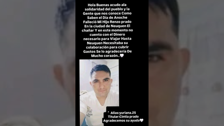 "Acudo a la solidaridad del pueblo y la gente que nos conoce. Como saben, anoche falleció mi hijo Renzo Prado en la ciudad de El Chañar, Neuquén, y en este momento no cuento con el dinero necesario para viajar. Necesito de su colaboración para cubrir gastos, se lo agradecería de corazón", escribió la mujer.