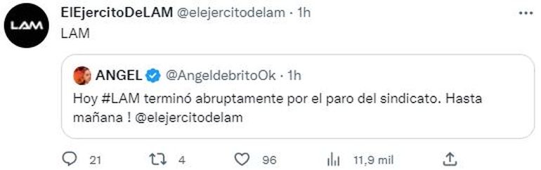 Rápidamente, el conductor del ciclo acudió a Twitter para hacer referencia a lo que había ocurrido y sobre todo para llevar tranquilidad a los televidentes y seguidores del programa. "Hoy #LAM terminó abruptamente por el paro del sindicato. Hasta mañana ! @elejercitodelam", escribió De Brito en su cuenta refiriéndose al paro de SATSAID en reclamo de aumentos salariales.