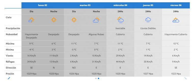 Para el lunes la mínima estimada alcanzará los 4 grados bajo cero y la máxima no superará los 9 grados con cielo despejado, mientras que el martes se esperan 5 grados bajo cero de mínima, una máxima de 11 grados y cielo nublado.