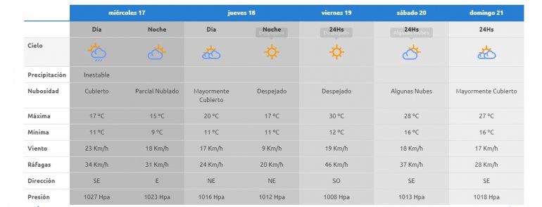 Para el miércoles, la AIC pronosticó que continuará el tiempo inestable con posibles precipitaciones. La temperatura máxima descenderá a los 17 grados y la mínima a 8. El viento será de unos 15 kilómetros por hora y las ráfagas de 28 kilómetros por hora.