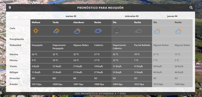 Para el miércoles se pronosticó cielo mayormente cubierto con probabilidad de tormentas, lluvias, chaparones y granizos en la región. Se mantendrán las temperaturas altas, se espera una máxima de 32 grados y una mínima de 7°C. El viento también irá en ascenso. Se prevé viento de moderado a fuerte de 41 kilómetros por hora, con ráfagas de hasta 53 kilómetros por hora.