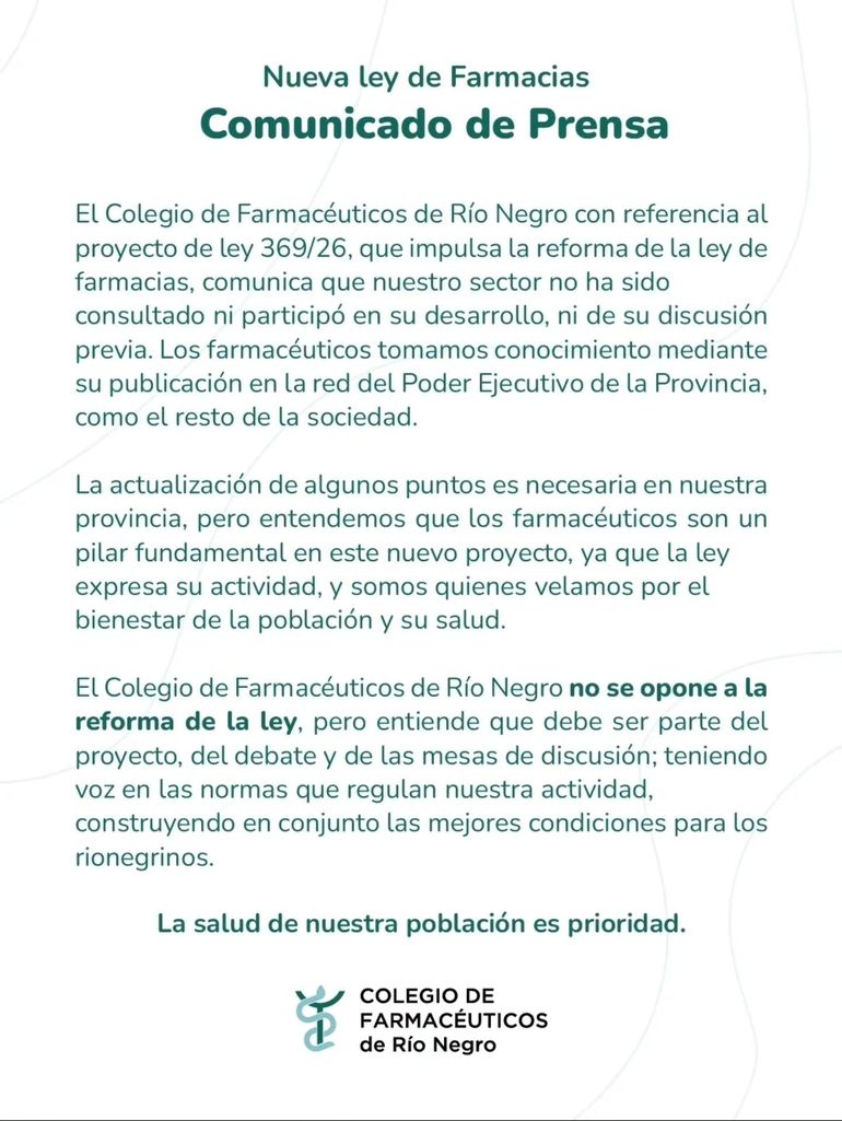La reforma de la Ley de Farmacias que impulsa el Gobierno de Río Negro sumó en las últimas horas un nuevo capítulo de tensión. El Colegio de Farmacéuticos reclamó haber sido excluido del proceso de elaboración del proyecto, sumándose a los cuestionamientos de legisladores opositores.