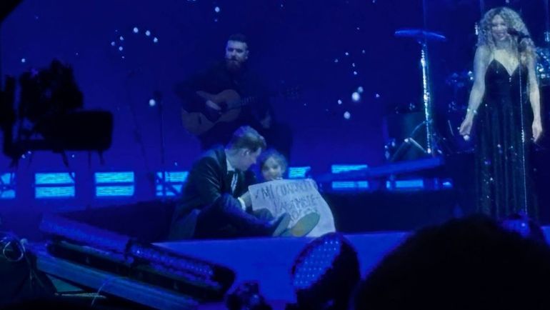 El famoso cantante vio un cartel que mostraba una niña y la hizo subir al escenario para que lo acompañe en una canción. También le cantó el feliz cumpleaños a otra fanática.