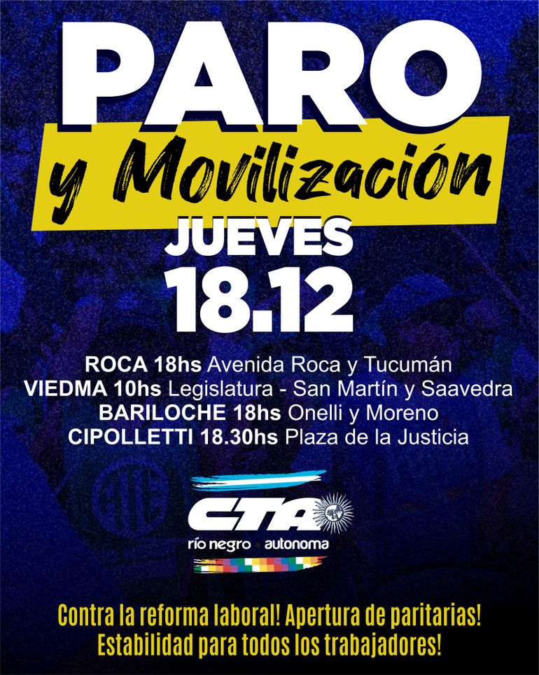 Este jueves 18 de diciembre se desarrollará en Río Negro una jornada de paro y protestas contra el proyecto de reforma laboral impulsado por el Gobierno nacional. La convocatoria tendrá distintas modalidades según las centrales sindicales: la CTA Autónoma resolvió un paro en toda la provincia, mientras que la CTA de los Trabajadores y la CGT anunciaron una jornada de protesta con movilizaciones, sin paro general.